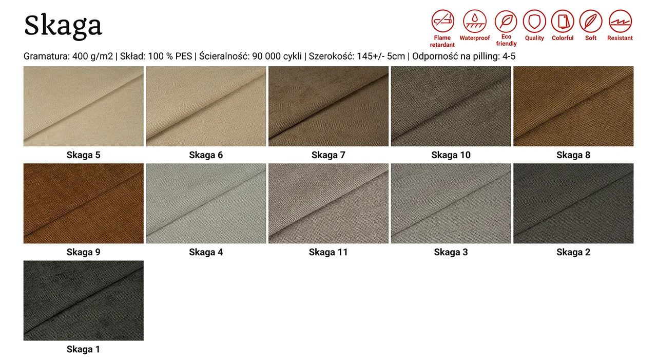 Skaga to wysokiej jakości tkanina obiciowa, która łączy estetykę i funkcjonalność, spełniając oczekiwania nawet najbardziej wymagających wnętrz. Dzięki trudno zapalnym właściwościom zwiększa bezpieczeństwo użytkowania, a jej wyjątkowa odporność na ścieranie i uszkodzenia sprawia, że idealnie sprawdza się zarówno w domach, jak i przestrzeniach komercyjnych. Miękka i przyjemna w dotyku faktura podkreśla elegancję mebli, dodając im luksusowego charakteru. Tkanina o właściwościach hydrofobowych.
